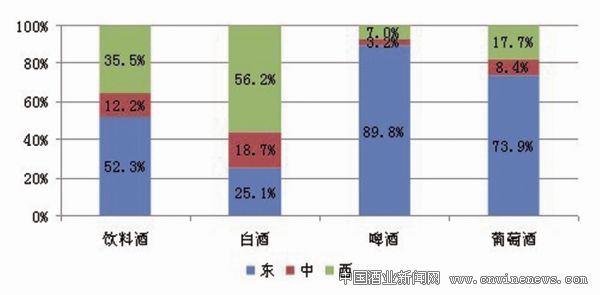 2012年全国典型酒类流通企业饮料酒销售额地区占比,东部为52.3%,中部为12.2%,西部为35.5%。其中,东部地区葡萄酒、啤酒的销售额占比分别为73.9%和89.8%,西部地区白酒销售额占比为56.2%。