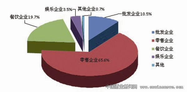 根据商务部酒类流通统计监测系统数据及部分地区酒类流通企业备案登记数据测算,2012年酒类经营企业约300万家,其中批发经营者31.5万家,占比10.5%;零售经营者196.8万家,占比65.6%;餐饮经营者59.1万家,占比19.7%;娱乐企业10.5万家,占比3.5%。