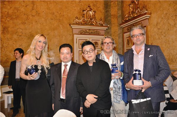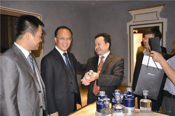 沱牌舍得酒业副总经理李富全先生及计文波先生向意大利时尚界名流赠送舍得酒。