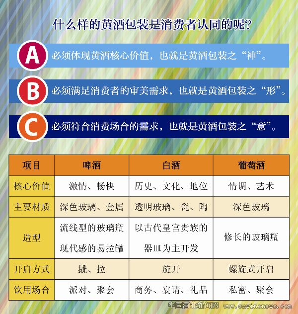 通过以上分析,我们发现这三类酒的包装的共同特征:一是体现品类的核心价值,二是愉悦当下消费群的审美,三是迎合了消费场合的需求。因此只有“神、形、意”兼备的黄酒包装才能得到消费者的认同,这三方面的具体表现为: