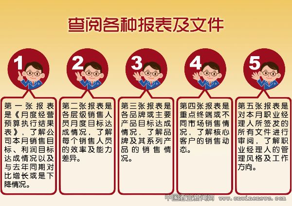 老板对职业经理人权力的下放更多的是一种授权,而不是放权,其目的是将繁杂、细琐的管理工作交由职业经理人去推动和执行,自己则强化对营销结果的管控,以及对营销过程的监督和审核。所以,老板们每个月最核心的工作就是查阅各种营销报表及文件;时间在3~5天左右,必须要很细致地根据各项报表和文件,全面掌握公司的运营情况,以及未来可能潜藏的风险和危机。