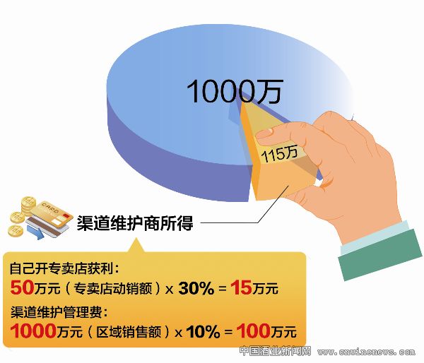 比如,在1000万元的营销蛋糕里,渠道维护商自己开设的专卖店可产生50万元的动销,可获利15万元左右;区域内产生的1000万元动销,渠道维护商还可获利100万元左右,两项相加的回报为115万元。