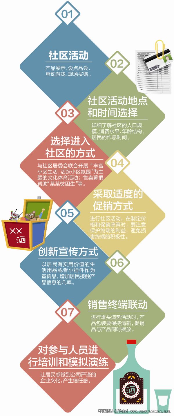 社区活动是经销商实现产品与消费者近距离密切接触的一种品牌宣传方式,通过产品展示、设点品尝、互动游戏、现场买赠等直观、生动、高效的方式实现对消费者的品牌传播。白酒经销商通过社区活动可以培养试饮人群,促进终端客户开发,带动终端动销,鼓励通路各成员的销售积极性。