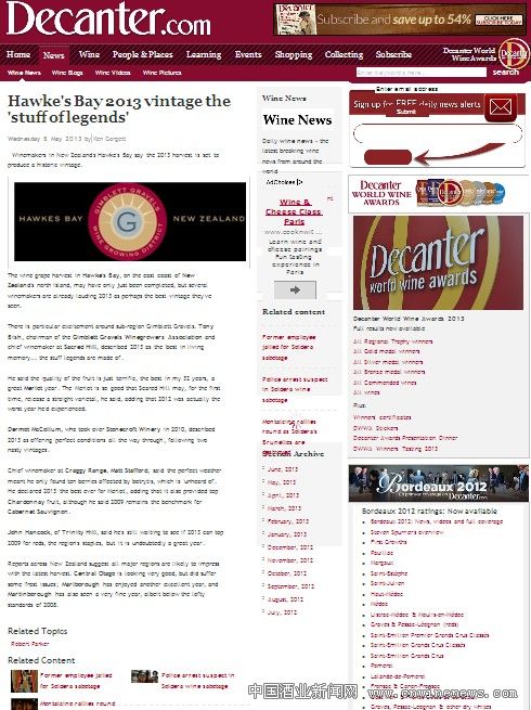 霍克斯湾子产区Gimblett Gravels葡萄种植协会主席、Sacred Hill酒庄首席酿酒师Tony Bish称,2013年为“记忆中的最佳年份,极具传奇色彩。”
