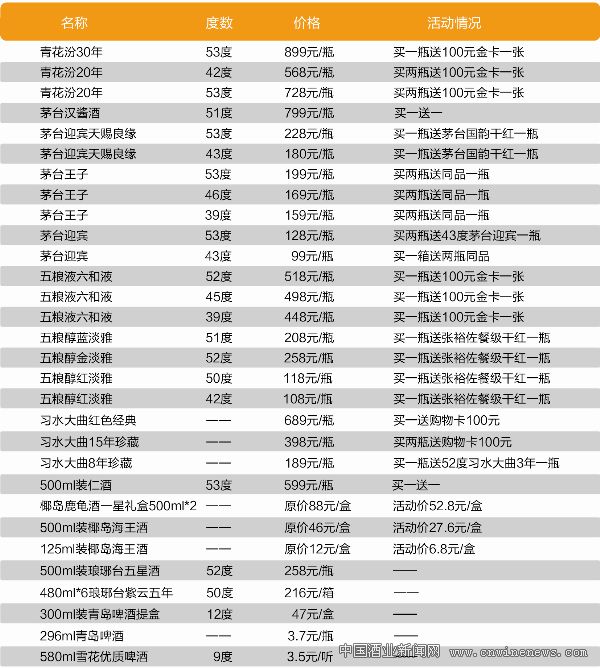 青岛商超部分酒类产品价格一览表