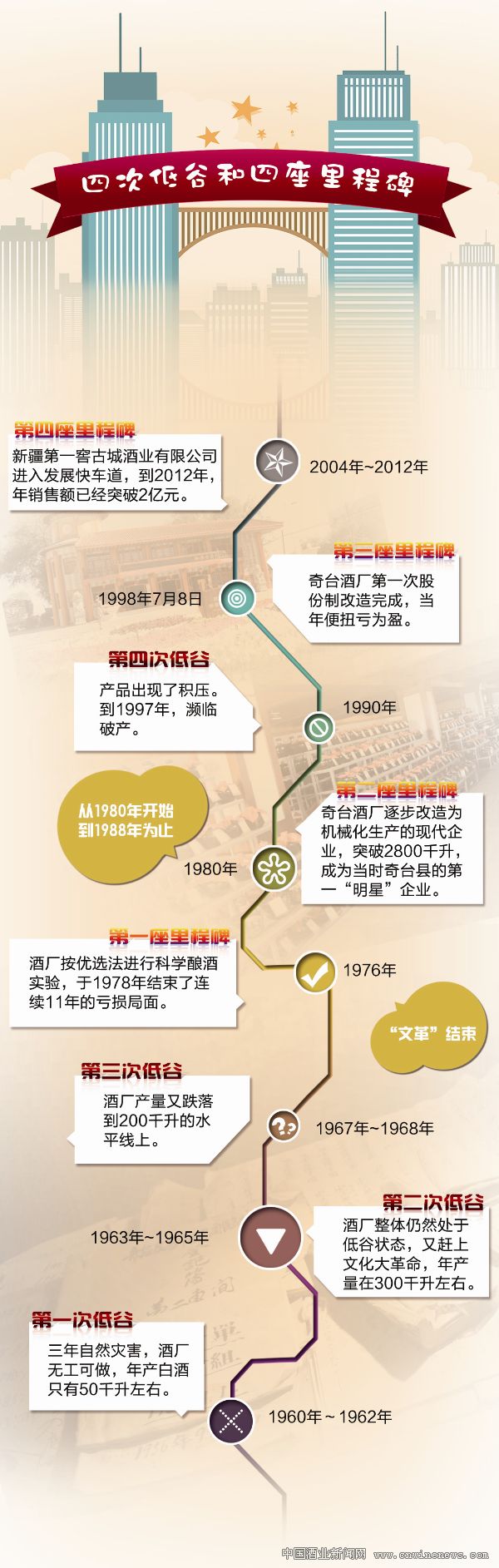 然而古城酒业的发展历程并非一帆风顺,相反充满坎坷磨难,命运多舛。用新疆第一窖古城酒业有限公司董事长兼总经理周文贵的话来说,从酒厂到酒业公司的60年历史中,一共经历了四次明显的低谷,但更令古城人欣慰和自豪的是,在每次低谷之后,他们总能在逆境中奋起,于是便有了四座“里程碑”的熠熠生辉。