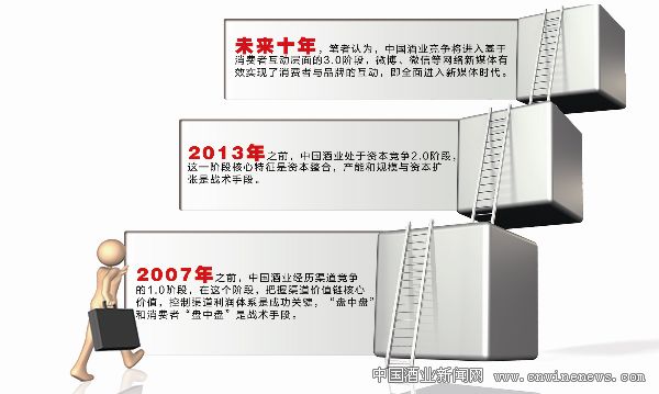 基于对行业发展周期特征的研究,笔者认为,2007年之前,中国酒业经历了渠道竞争的1.0阶段,在这个阶段,把握渠道价值链核心价值,控制渠道利润体系是成功关键,“盘中盘”和消费者“盘中盘”是战术手段;2013年之前,中国酒业处于资本竞争2.0阶段,这一阶段核心特征是资本整合,产能和规模与资本扩张是战术手段;未来十年,笔者认为,中国酒业竞争将进入基于消费者互动层面的3.0阶段,即新媒体时代。