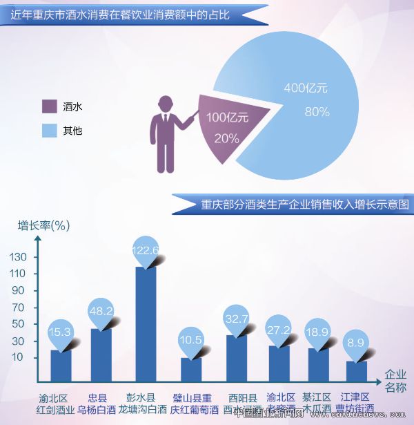 但是,以上数据是在重庆商贸酒管部门备案登记的酒类经营户中统计得来的,与实际消费情况有很大的出入,原因是酒类流通由于法律法规的缺陷和管理体制的混乱,很大程度上处于放任自流状态,酒类消费的实际情况根本无从统计,比如一些个人团体自行到酒厂采购部分、地下批发商经营部分、自带酒水消费部分等等;近几年重庆市餐饮业消费额每年500亿元左右,按酒水占比20%计,仅此一项就达100亿元左右。因此,业内人士估计重庆市近几年实际酒类消费额每年应在200亿元以上。那么,“十一五”期间酒类消费年均增幅在27%以上,则远远高于重庆市GDP和社会消费品零售总额的增幅。