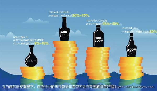 据正一堂营销咨询机构董事长杨光分析,在当前的宏观背景下,白酒行业的未来趋势和希望将会在中低端价位产品上。800元/瓶以上的高端白酒销量增速将大幅放缓,估计年增长速度约在8%~15%;而300元/瓶~800元/瓶的次高端酒,年增幅预计20%~25%;100/瓶~300元/瓶的酒预计年增幅为25%~30%,而100元/瓶以下的中低端白酒,年增幅将达到30%以上。