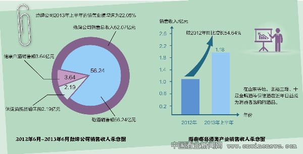 近期,国内最大的保健酒企业劲牌公司透露,其2013年上半年的销售业绩增速为22.05%,以2012年6月~2013年6月经营年度为例,公司实现销售收入62.07亿元,其中劲酒实现销售额56.24亿元;保健酒新品实现销售额2.19亿元;健康白酒实现销售额3.64亿元。