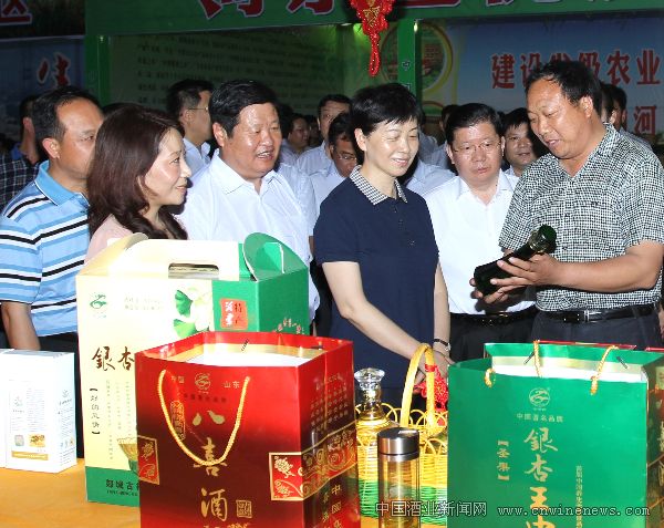 图为王侠主任(中)在山东临沂市委副书记、市长陈先运(右二)等领导陪同下听取赵宗伟(右一)介绍银杏酒新产品开发情况。