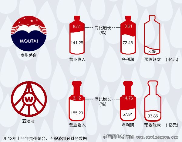 文章来源华夏酒报; 8月中下旬,五粮液(000858)和贵州茅台(600519)先后发布2013年中报。报告显示,贵州茅台今年上半年营业收入为141.28亿元,比去年同期增长6.51%;净利润为72.48亿元,同比增长3.61%。其中,净利润增幅为贵州茅台自2001年上市以来的历史新低,而营收增幅也只高于2003年非典时期,为上市以来第二低。