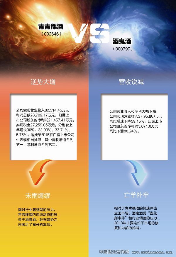 其中更以青青稞酒(002646)30%的营收涨幅与酒鬼酒(000799)营收同比锐减59.15%为代表。