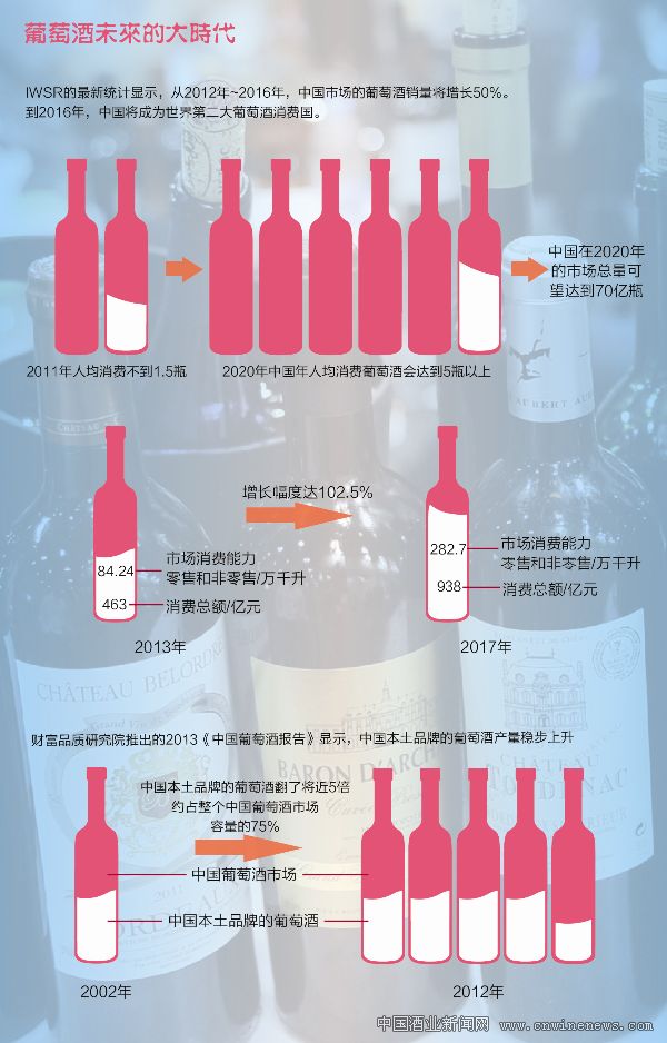 在此之前,全球领先的消费、产品和市场情报供应商英敏特(Mintel)最新发布的葡萄酒行业分析报告指出,中国目前葡萄酒市场消费能力(零售和非零售)为84.24万千升,总额达到463亿元人民币。其预计,到2017年中国葡萄酒市场消费能力将达到282.7万千升,消费总额达到938亿元人民币,增长幅度达102.5%,在2012年期望值基础上的复合年增长率为15.2%。