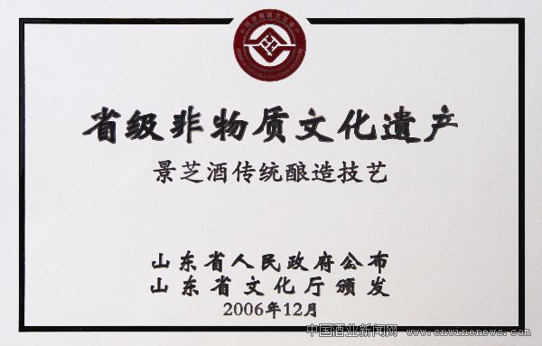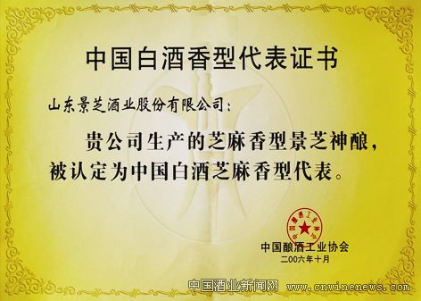 2006 年,景芝芝麻香传统酿造工艺被山东省政府公布为“首批省级非物质文化遗产”,并作为山东省白酒行业唯一酿造工艺申报了国家级非物质文化遗产,芝麻香型白酒的五项技术成果申报了国家专利。同年,由国家商务部、中国酒业协会等在济南联合隆重举行“一品景芝(景芝神酿)酒——中国白酒芝麻香型代表”授牌仪式,标志着中国芝麻香的代表品牌正式诞生。