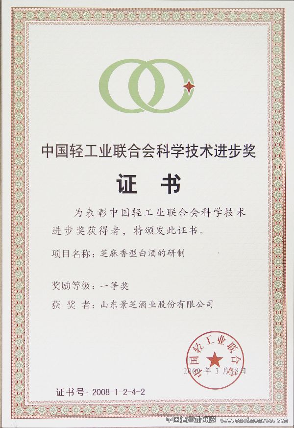 2008年,景芝酒业又受委托起草了“芝麻香型白酒地理标志保护产品国家标准”,以“一品景芝”为代表的芝麻香型白酒,被国家确认为中国芝麻香型白酒行业唯一的“国家地理标志保护产品”。