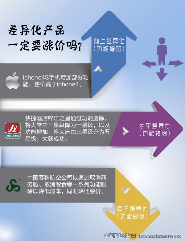 有人认为差异化产品是提高卖出价的关键,其实是指向上差异化——通过差异化产生的新功能来满足消费者的其它产品所不能满足的需求,从而施行撇脂定价(典型如iphone4S手机),而忽略了另外两种差异化类型。