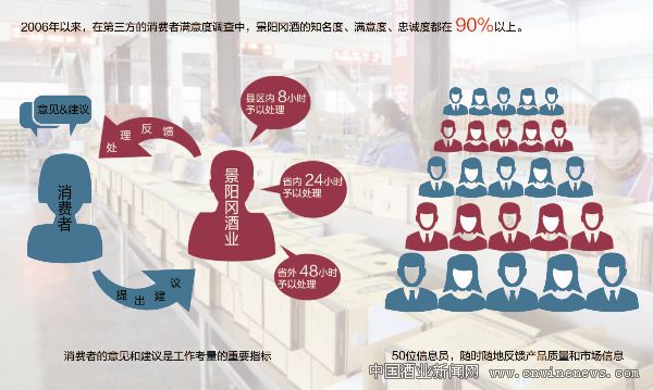 消费者的意见和建议也是景阳冈对自身工作考量的重要指标。对于消费者提出的意见和建议,企业针对不同区域提出了相应的实效要求。县区内8小时予以处理,省内24小时予以处理,省外48小时内予以处理。同时,企业还在社会范围内聘请了50多位质量信息员,随时随地反馈产品质量和市场信息。据了解,自2006年以来,在第三方的消费者满意度调查中,景阳冈酒的知名度、满意度和忠诚度都在90%以上。