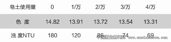 根据大生产中添加2/万皂土和0.5/万蛋清粉在过滤后得到的色度测定结果,对比后发现两者相差不大。蛋清粉由于成本和特性等问题,其操作要求更加严格,添加后需要更长的澄清时间,所以在大生产中一般选择使用皂土。