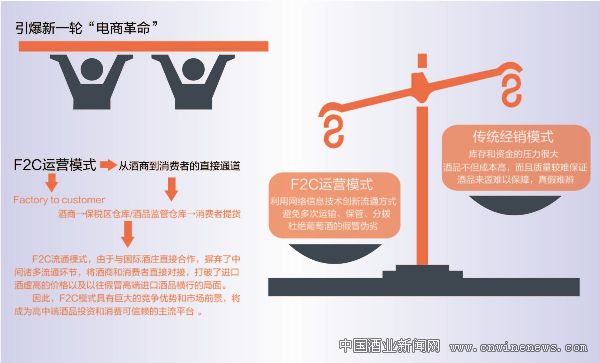 业内人士普遍认为,目前中国葡萄酒市场已进入一个大调整、大洗牌阶段,而由于之前爆发式的增长给市场带来了诸多问题,F2C模式将打造具有国际影响力的酒类现货投资及贸易的电子交易平台,充分利用综合保税区优势,大力发挥保税仓储分拨、国际采购集拼、离岸贸易和免税展示等优惠政策,重点引进世界各地的高品质葡萄酒,建立集仓储、交易、展示、物流一体化的国际酒品交易市场。其在保真、价格、仓储方面独具优势,势必挑战其它交易模式。