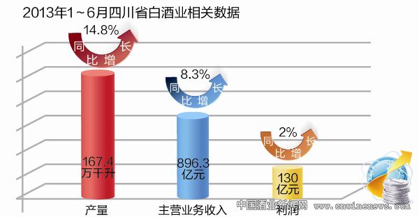 据四川省酿酒协会数据显示,2013年1月~6月,四川省规模以上273家白酒企业累计完成产量167.4万千升,比去年同期增长14.8%;实现主营业务收入896.3亿元,同比增长8.3%;利润为130亿元,同比增长2%。总体来看,川酒上半年仍然呈现出增长的态势,但如果将增速与2012年的情况相比,可明显看到差距。