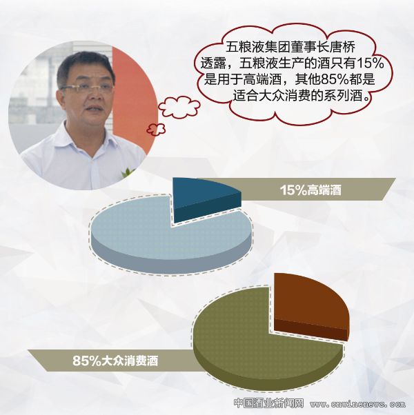 早在去年3月,五粮液集团董事长唐桥在接受《华夏酒报》记者采访时就透露,要加大对中低端产品的开拓力度。当时他对政策风险已经有所担忧,并且一再强调,五粮液生产的酒只有15%是用于高端酒,其他85%都是适合大众消费的系列酒。