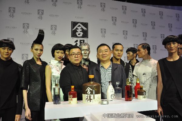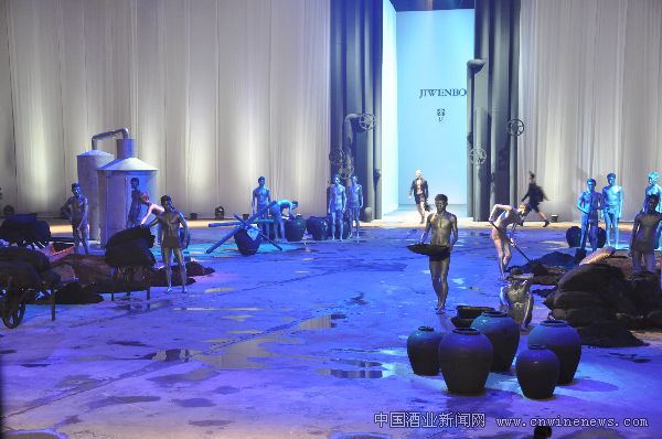 一名全身赤裸被涂成银色的女模怀抱黑色“舍得”大酒罐走上T台,随后两名同样被涂成银色的裸男出场,三人站在T台中央,在健壮与清秀、柔与韧、男性与女性之间的强烈对比下,展现出人体的美,拉开了JIWENBO·舍得高级成衣发布会的序幕。