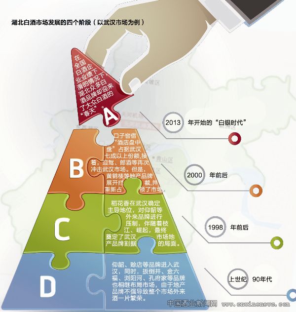 自古以来,得武汉者得湖北,得武汉者得两湖,得两湖者得天下。对于白酒来说,在湖北,省会城市武汉,注定是一个不能绕过的竞争市场所在。据资料统计,目前武汉市场白酒年销售量接近7万千升,整个市场销售的白酒品种约有近400个,“接地气”的湖北本地白酒,占了总销量的三分之二。