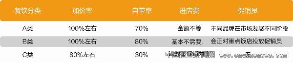 A类餐饮:进店固定费用相对较低,适应于启动终端盘中盘;B类餐饮:绝多数无进店费,服务员主导的店数量较多;C类餐饮:无进店费,店主利润需求相对较高。