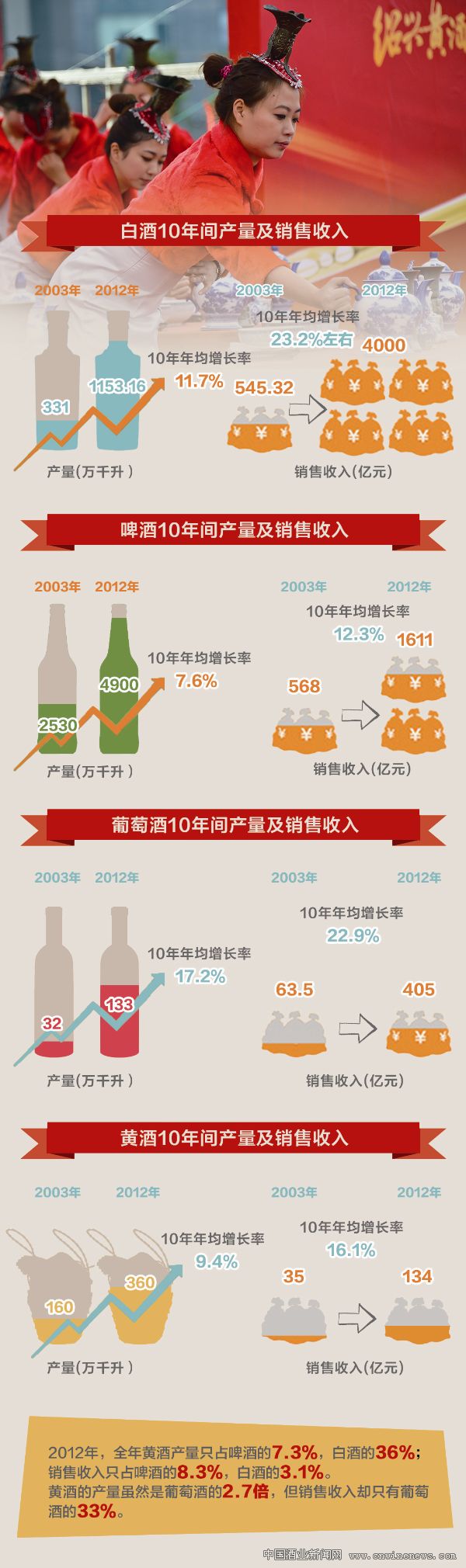 黄酒行业呢?产量从2003年的160万千升上升到2012年的360万千升(行业估算数据),年均增长率为9.4%左右;销售收入从2003年的35亿元到2012年的134亿元,10年间年均增长率为16.1%。