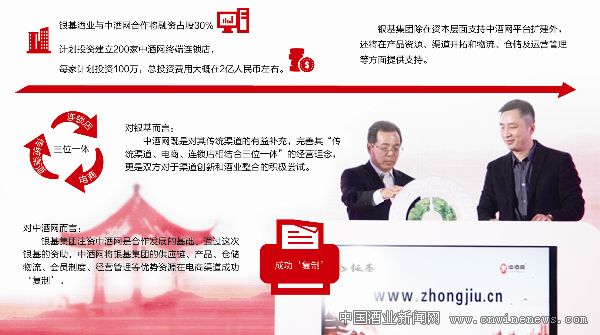 中酒网对于战略合作伙伴银基集团而言,既是对其传统渠道的有益补充,完善其“传统渠道、电商、连锁店相结合三位一体”的经营理念,更是双方对于渠道创新和酒业整合的积极尝试。
