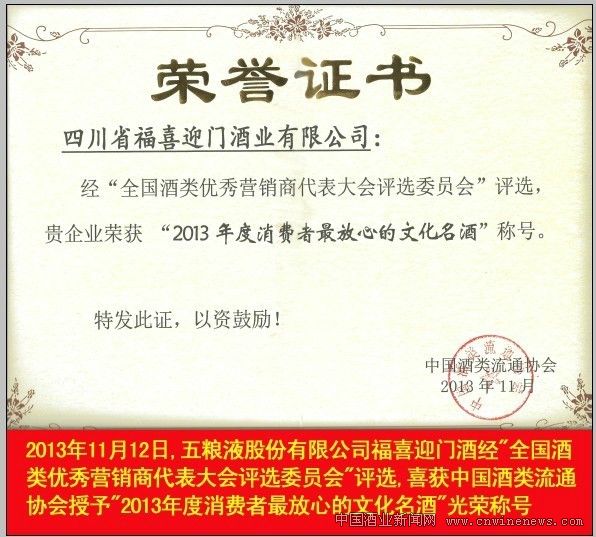 宜宾五粮液股份有限公司生产的福喜迎门酒经"全国酒类优秀营销商代表大会评选委员会"评选,荣获中国酒类流通协会授予"2013年度消费者最放心的文化名酒"称号