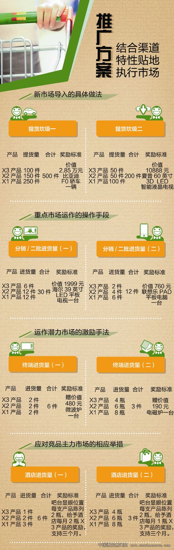 四、竞品主力市场:酒店渠道的消费者培育为导向。针对竞品的重点区域市场,消费者的消费习惯培育、产品消费体验的建立、品牌培育是重点。因此,在此类市场,X系列产品将市场力度主要投放在酒店终端网络建设、消费者消费引导等方面。