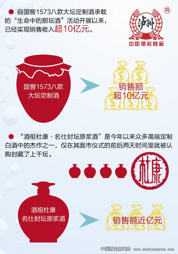 但是,在近一年来,高端定制白酒的市场表现却分外突出。泸州老窖在全国各地巡回举行 “生命中的那坛酒”系列活动,所到之处,个性化可定制的国窖1573产品都受到热烈追捧。杜康、景芝等多家区域强势企业则根据自身的品牌、品质特性,打造推出了封坛定制酒,同样取得了良好的销售表现。定制酒的强势崛起,与传统高端产品的低迷冷清之间形成了鲜明对比。