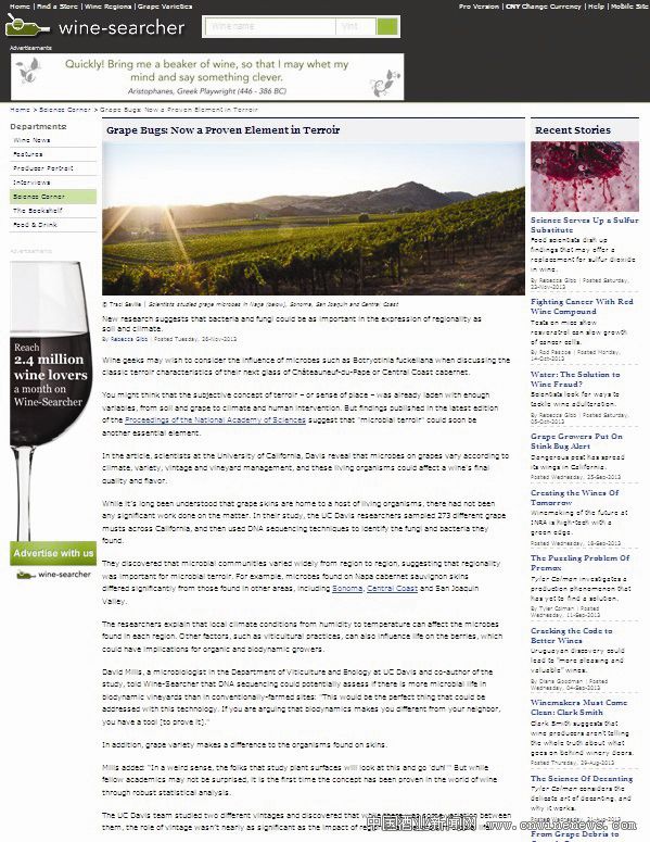 这一研究结果已刊登在《美国科学院院报》上。该研究表明,气候、品种、年份、葡萄园管理等因素都会影响到葡萄上的微生物,从而影响一款葡萄酒最终的品质与风味。