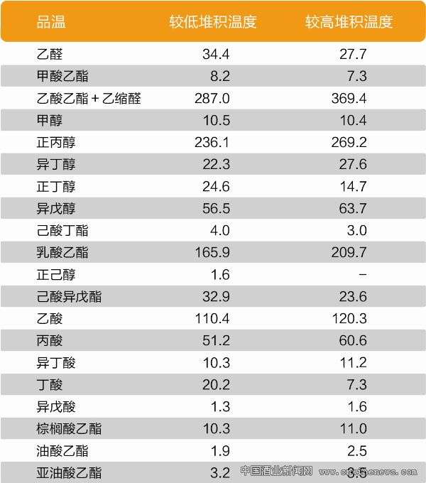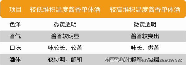 由国家白酒评委、山东省白酒评委和公司评酒委员对两种堆积温度条件下的半成品酒进行了品尝对比,结果见表3。