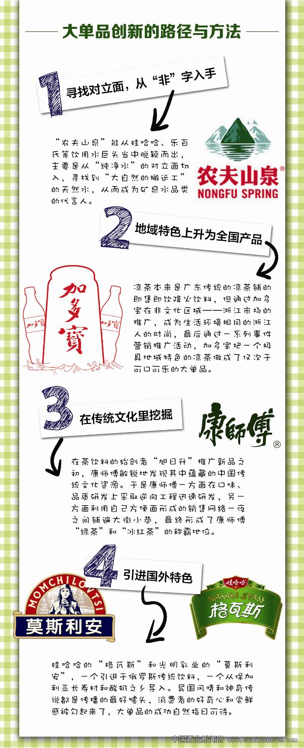 康师傅虽然不是茶饮料的发明者和先行者,但是康师傅“绿茶”和“冰红茶”却是不折不扣茶饮料中的大单品。这就是因为在茶饮料的始创者“旭日升”推广新品之初,康师傅就敏锐地发现,其中蕴藏的中国传统文化资源。于是康师傅一方面在口味、品质研发上采取逆向工程迅速研发,另一方面利用自己方便面形成的销售网络一夜之间铺遍大街小巷,最终形成了茶饮料大单品的称霸地位。
