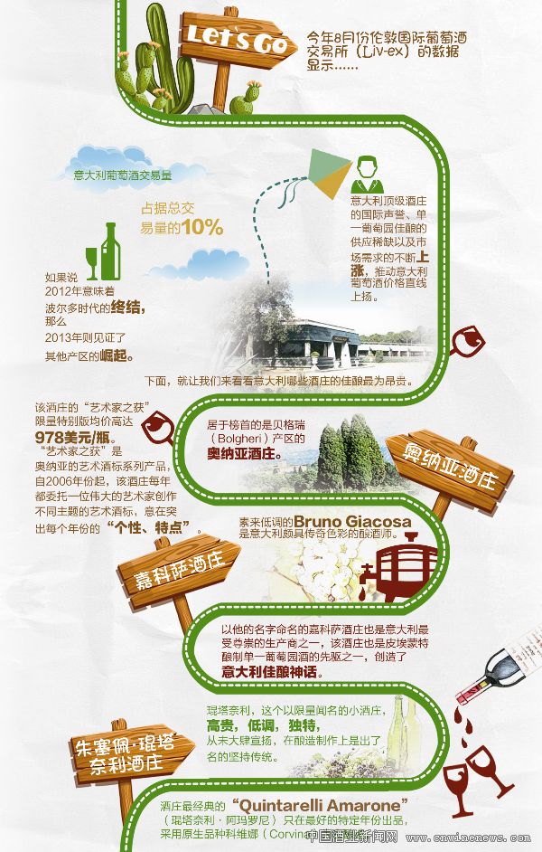该交易所9月份的市场报告称:“如果说2012年意味着波尔多时代的终结,那么2013年则见证了其他产区的崛起。”正如酒评家普遍认为的,意大利顶级酒庄的国际声誉、单一葡萄园佳酿的供应稀缺以及市场需求的不断上涨,都推动着意大利葡萄酒价格直线上扬。