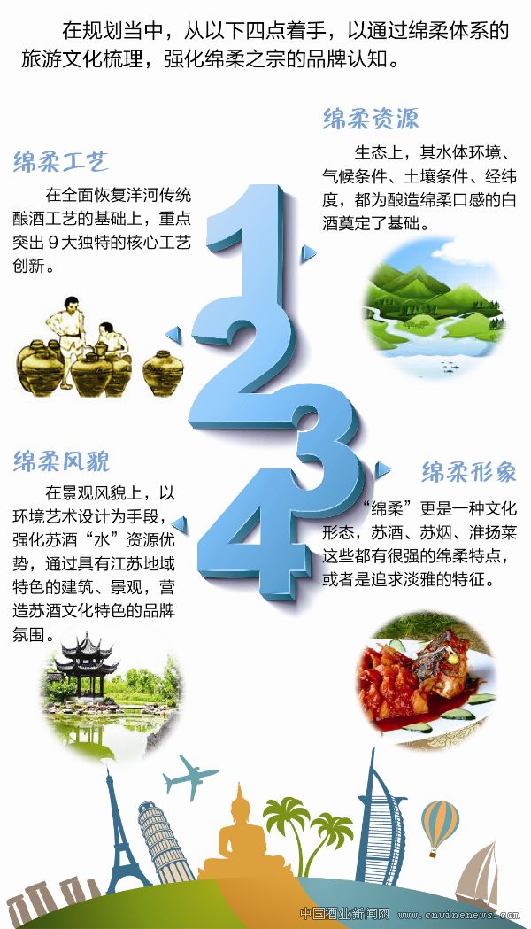 在白酒行业转型升级的新时代,洋河提出了“旅游也是生产力”、大力发展酒文化旅游的决定。在规划启动之初,江苏洋河酒厂股份有限公司(苏酒集团)董事长张雨柏就提出了衡量酒文化旅游成功与否的6条标准,即是否能做到“好酒有理由、酒里有文化、企业有特色、发展有道理、旅游有趣味、产业有未来”。