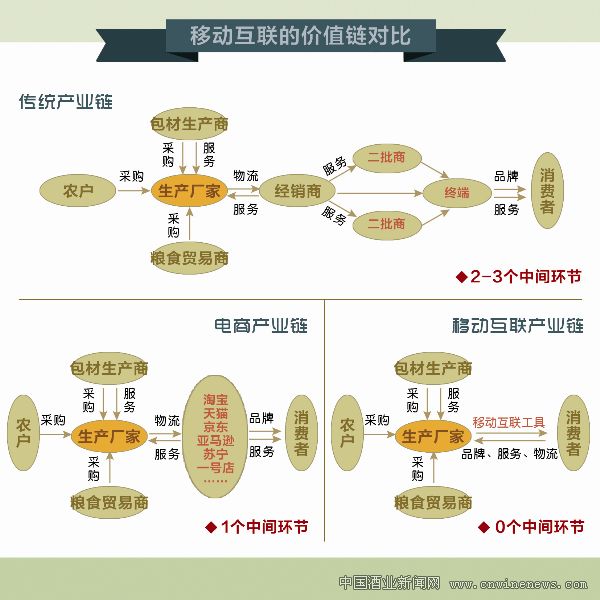 移动互联将真正实现企业与消费者最直接的互动,进而沉淀大数据。大数据时代已经来临,未来企业的竞争核心将来源于大数据。只有掌握大数据,才能真正准确、及时地把握消费者核心需求和需求变化趋势。甚至有人说,未来数据将是核心资产,有了数据就可以找到需求进而设计产品,有了产品设计就可以寻找生产供应商,企业完全可以实现高度轻资产化,整个产业价值排序将会被颠覆。如此一来,白酒企业能否做好电商关乎企业命脉。