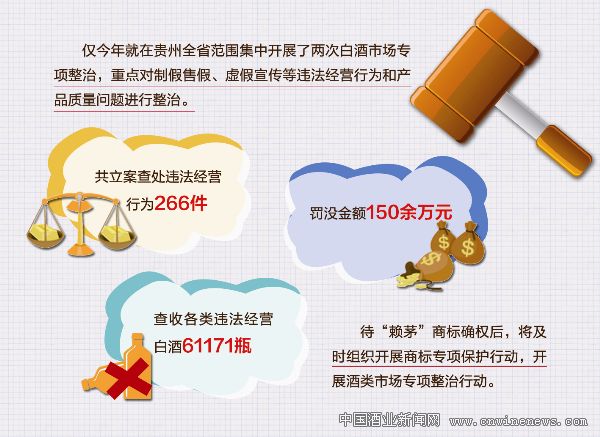 据贵州省工商局市场处副处长杨建华介绍,由于白酒是贵州省支柱产业,一直以来省工商局都极其重视白酒市场监管工作。仅今年就在全省范围集中开展了两次白酒市场专项整治,重点对制假售假、虚假宣传等违法经营行为和产品质量问题进行整治,共立案查处违法经营行为266件,查收各类违法经营白酒61171瓶,罚没金额150余万元。待“赖茅”商标确权后,将及时组织开展商标专项保护行动,开展酒类市场专项整治行动,继续加大对酒类市场监管力度,严厉打击经营假冒等违法行为,积极争取组织全国性或区域性商标专项保护行动,维护贵州省名优白酒品牌声誉。