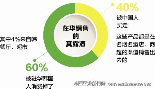 第二个是超市,以沃尔玛、家乐福等国际型超市居多,然后是跟地方知名卖场合作,这类合作比较多,比如物美、京客隆等。据真露调查,在华销售的真露酒60%都被驻华韩国人消费掉了,其中4%来自韩餐厅、超市,还有40%的产品来被中国人买走,而且,这些产品都是在名烟名酒店、商超的渠道销售出去的。
