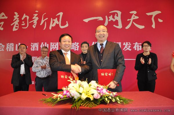 会稽山总经理傅祖康与酒仙网董事长郝鸿峰共同签署合作协议。