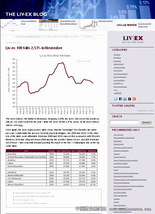 2013年11月,伦敦国际葡萄酒交易所(Liv-ex文章来源华夏酒报)佳酿100指数下降2.53个百分点,收于258.46,创下2013年最低值。此外,佳酿50指数也下跌了2.37%。