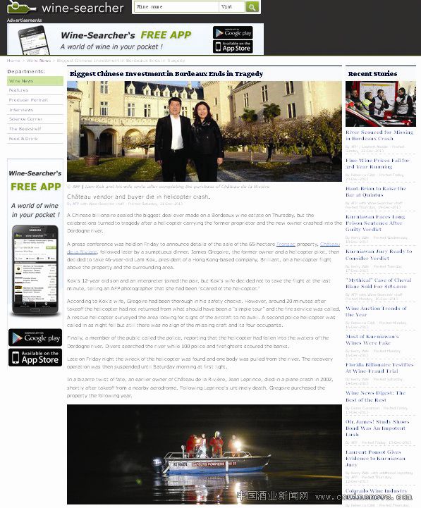 失踪的其中一名人员为大河酒庄(Chateau de La Rivière)的新主人,柏联集团总裁郝琳(Lam Kok),机上还有郝琳12岁的儿子和翻译。而负责驾驶直升机的是葡萄园卖家James Gregoire。郝林的文章来源华夏酒报妻子因惧怕乘坐直升机,在最后一刻没有登机而幸免于难。