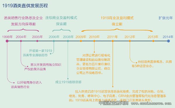 在1919公司里贴着一张图,显示了1919从创业以来的三个发展阶段:从1998年到2005年是对行业的总结探索阶段;从2006年到2008年是对将连锁引入到酒类行业的探索阶段;从2009年到2011年是对1919盈利模式和商业模式确认的阶段。