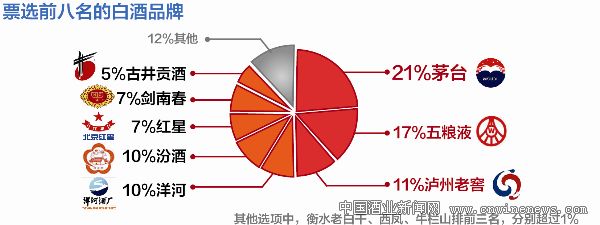 在经历了十年高速增长的黄金期后,2013年白酒业发展遭遇多重考验,“禁酒令”“禁礼令”等政策对白酒销售产生抑制,今年的高端白酒市场显得分外冷清。但是搜狐酒评网“年夜饭你最想喝什么酒”的调查结果显示,茅台、五粮液仍然首当其冲。有21%的网友过年最想喝茅台;有17%的网友选择了五粮液;排名第三的是泸州老窖,有11%的网友选择。另外,选择洋河、汾酒的网友各占10%。红星和剑南春的票数不相上下,分别有7%的网友选择了年夜饭最想喝这两种酒。在其他选项中,衡水老白干、西凤、牛栏山排前三名,均超过了1%。