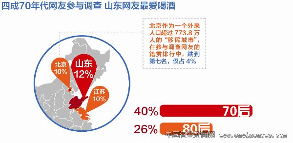 山东网友最爱喝酒 在参与调查的网友中,12%的人居住地为山东,其次是居住在江苏和北京的网友,分别为10%。北京作为一个外来人口超过773.8万人的“移民城市”,在参与调查网友的籍贯排行中,跌到第七名,仅占4%。40%的70后网友参与本次调查,其次是80后以及60后,占26%和23%,他们是年夜饭上喝酒的主力军,其他年龄段网友占调查总数的11%。