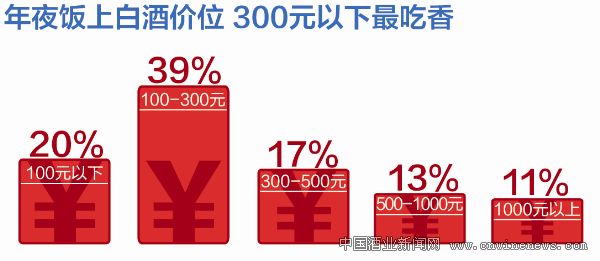 在年夜饭上,大家都会选择什么价位的白酒呢?有39%的网友选择了价位在100~300元之间的白酒,20%的网友选择了100元以下的白酒,而13%的网友选择了500~1000元的白酒。虽然年夜饭上,大家最想喝的是茅台和五粮液,但是却仅有11%的网友在年夜饭上会选择1000元以上的白酒。看来,在除夕之夜的年夜饭上,中低档白酒远比高档白酒吃香得多。