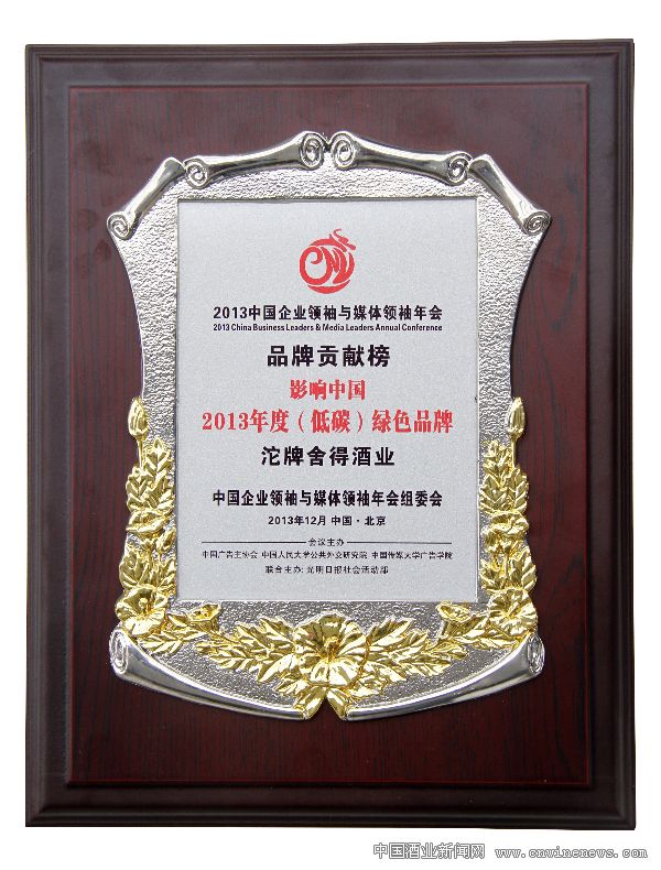 12月14日,以“文章来源中国酒业新闻网传播正能量,共筑中国梦”为主题,备受国内企业界、传媒界、艺术界关注的2013中国企业领袖与媒体领袖年会暨“品牌贡献榜”影响中国2013年度品牌盛典在北京盛大举行。以“生态循环、绿色环保”著称,并致力于“引领生态绿色酿酒,打造中国食品安全标杆企业”的沱牌舍得酒业荣获“品牌贡献榜•影响中国2013年度(低碳)绿色品牌”和“影响中国2013年度最佳产品质量品牌”,舍得酒也成为年会唯一指定用酒。